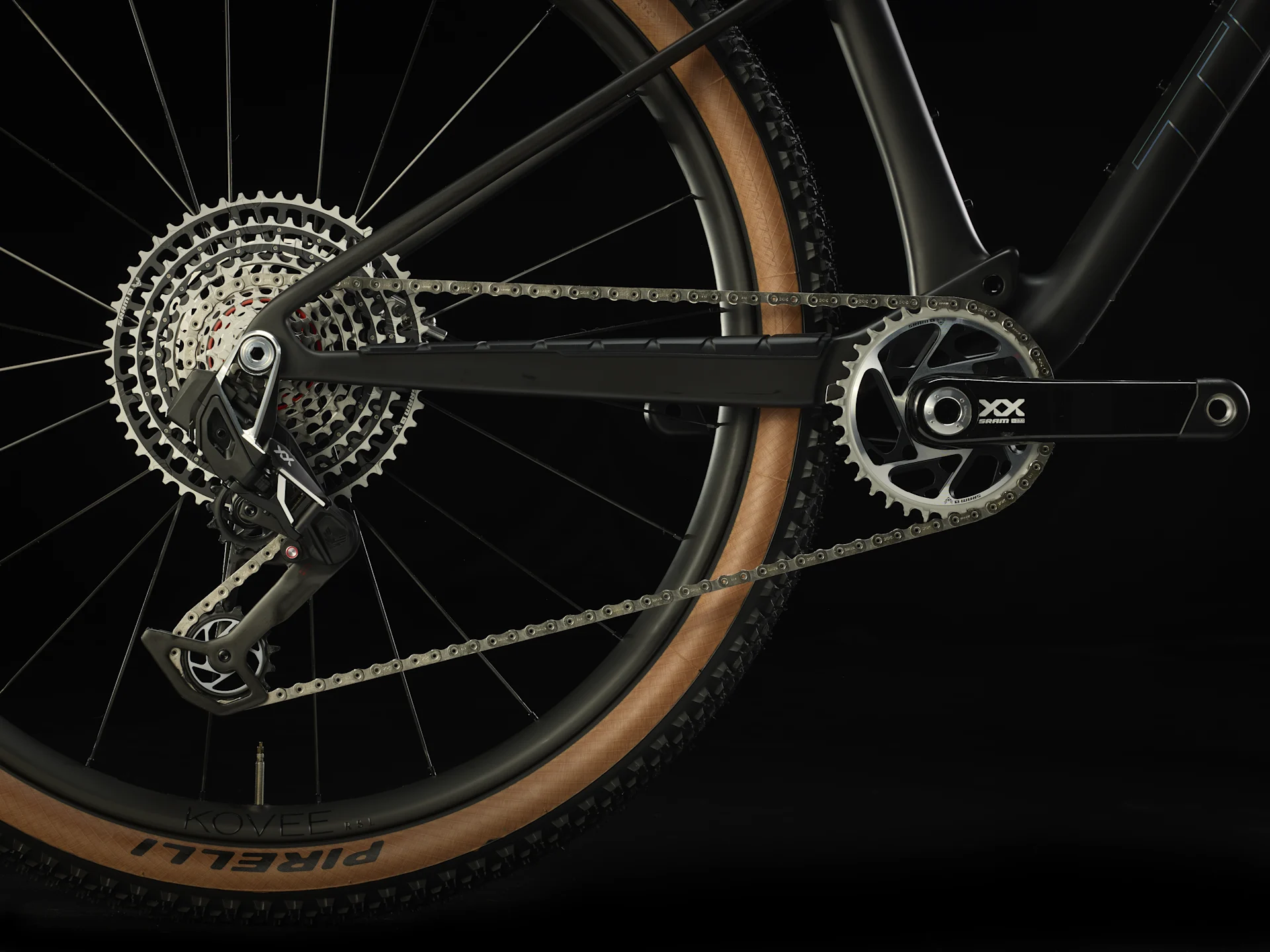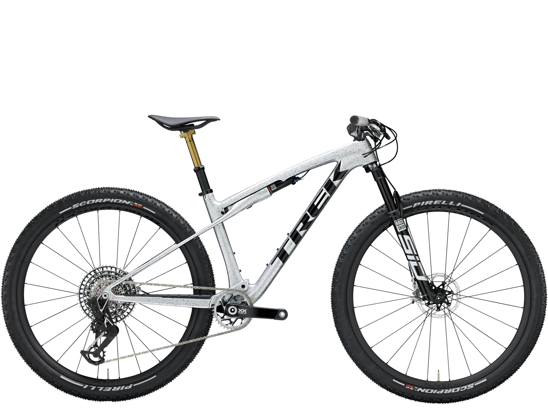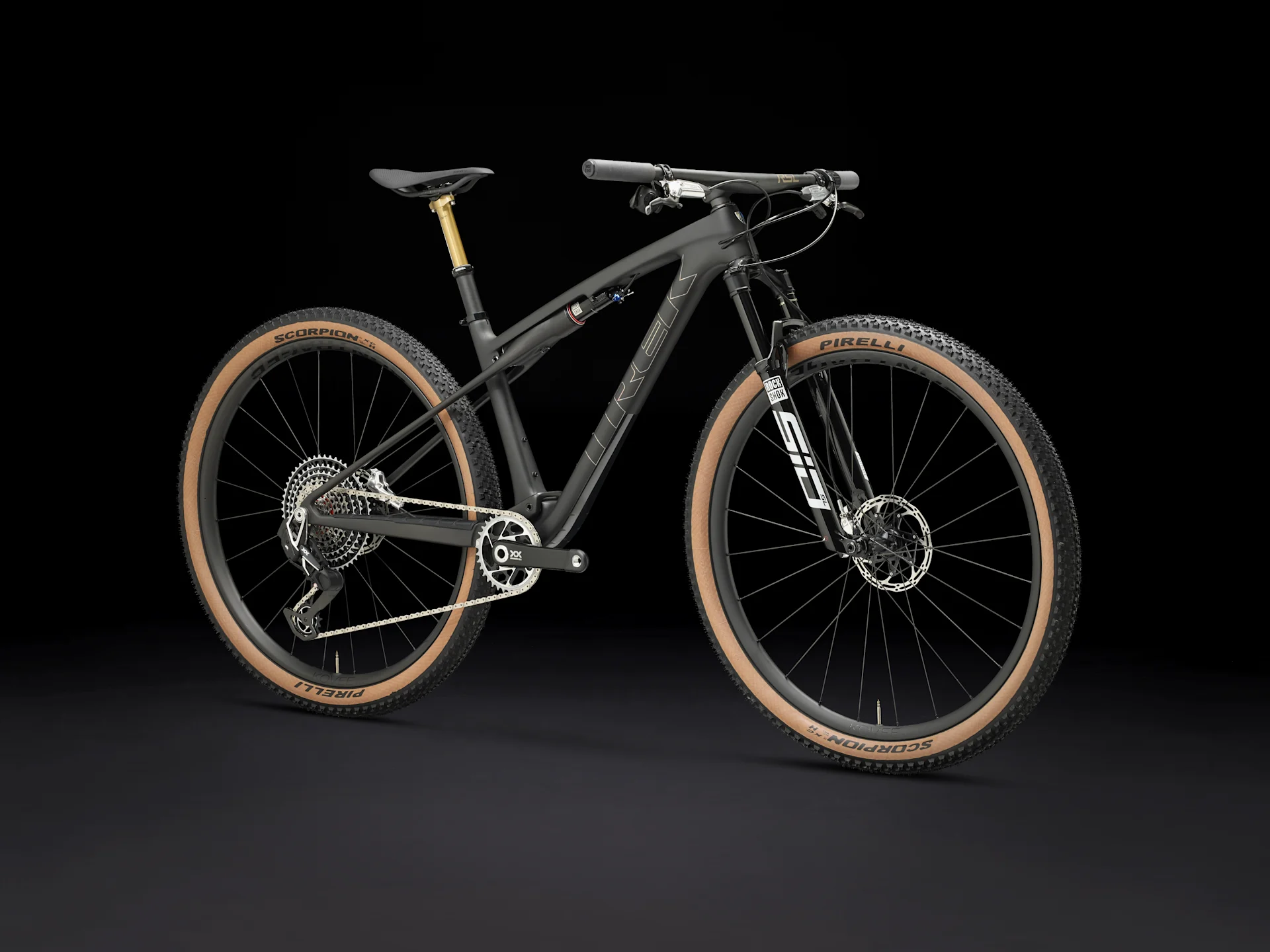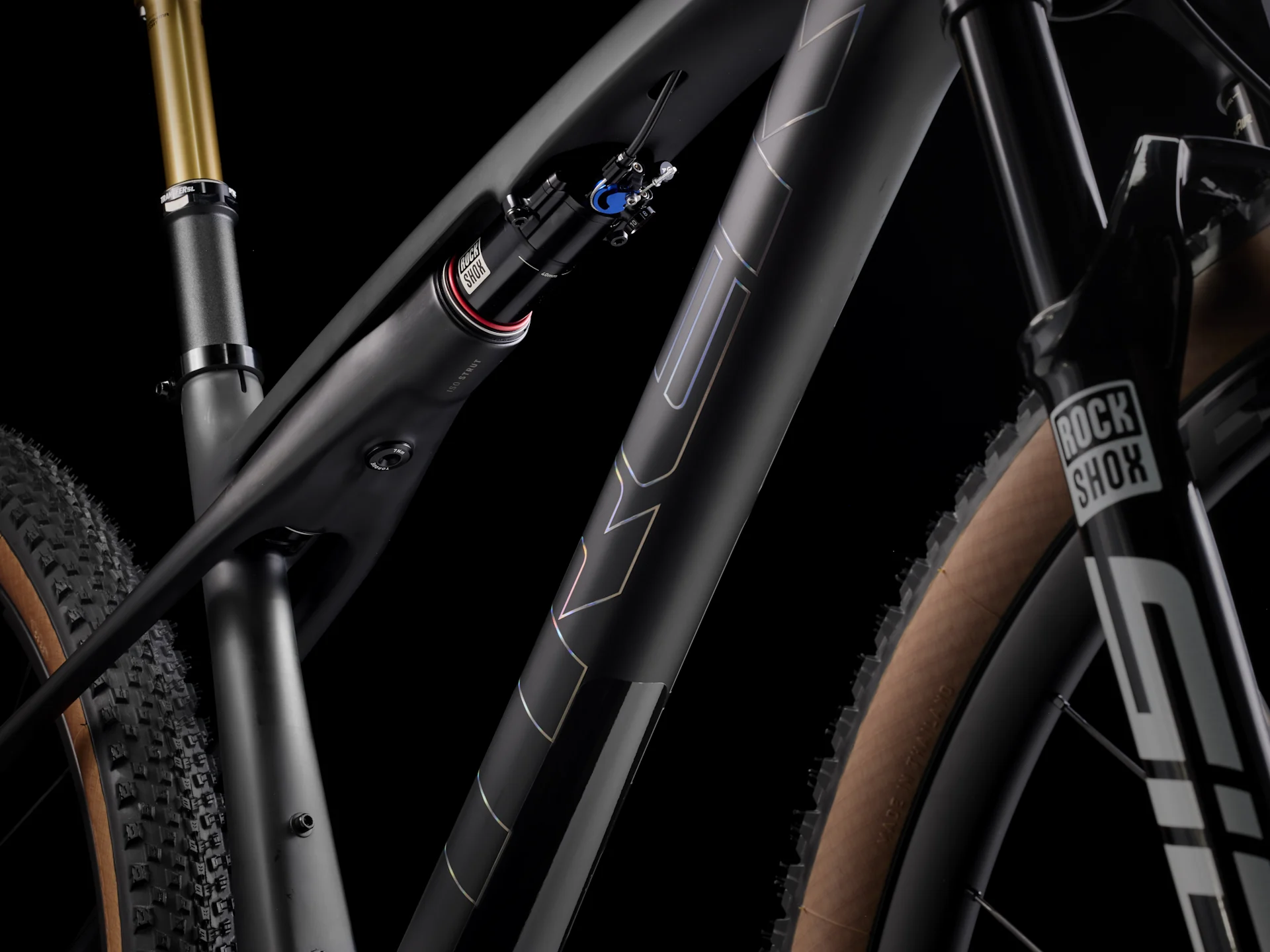 Einen federleichten Rahmen aus hochmoduligem SLR OCLV Mountain Carbon mit moderner XC-Geometrie. Außerdem bekommst du eine RockShox SID SL Ultimate 110-mm-Federgabel mit DebonAir-Federung und Charger Race Day Dämpfung und einen RockShox SIDLuxe IsoStrut 80-mm-Hinterbaudämpfer – natürlich komplett mit Remote-Lockout. Eine ultraleichte, komplett drahtlose elektronische SRAM XX SL AXS 12fach-Transmission, Bontrager Kovee RSL Carbonlaufräder, eine integrierte Bontrager RSL Lenker/Vorbau-Einheit aus Carbon, eine FOX Transfer SL Variosattelstütze und hydraulische SRAM Level Ultimate 4-Kolben-Scheibenbremsen runden das Ausstattungspaket ab.