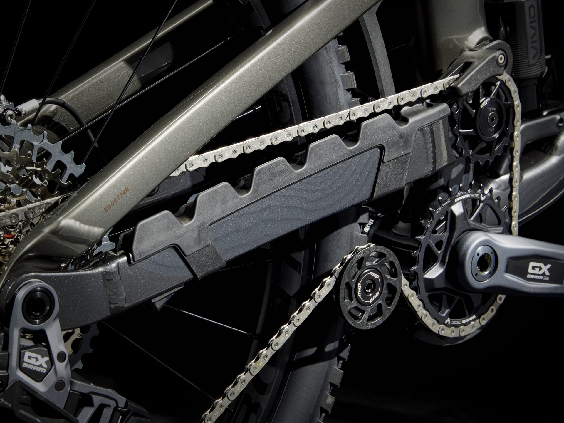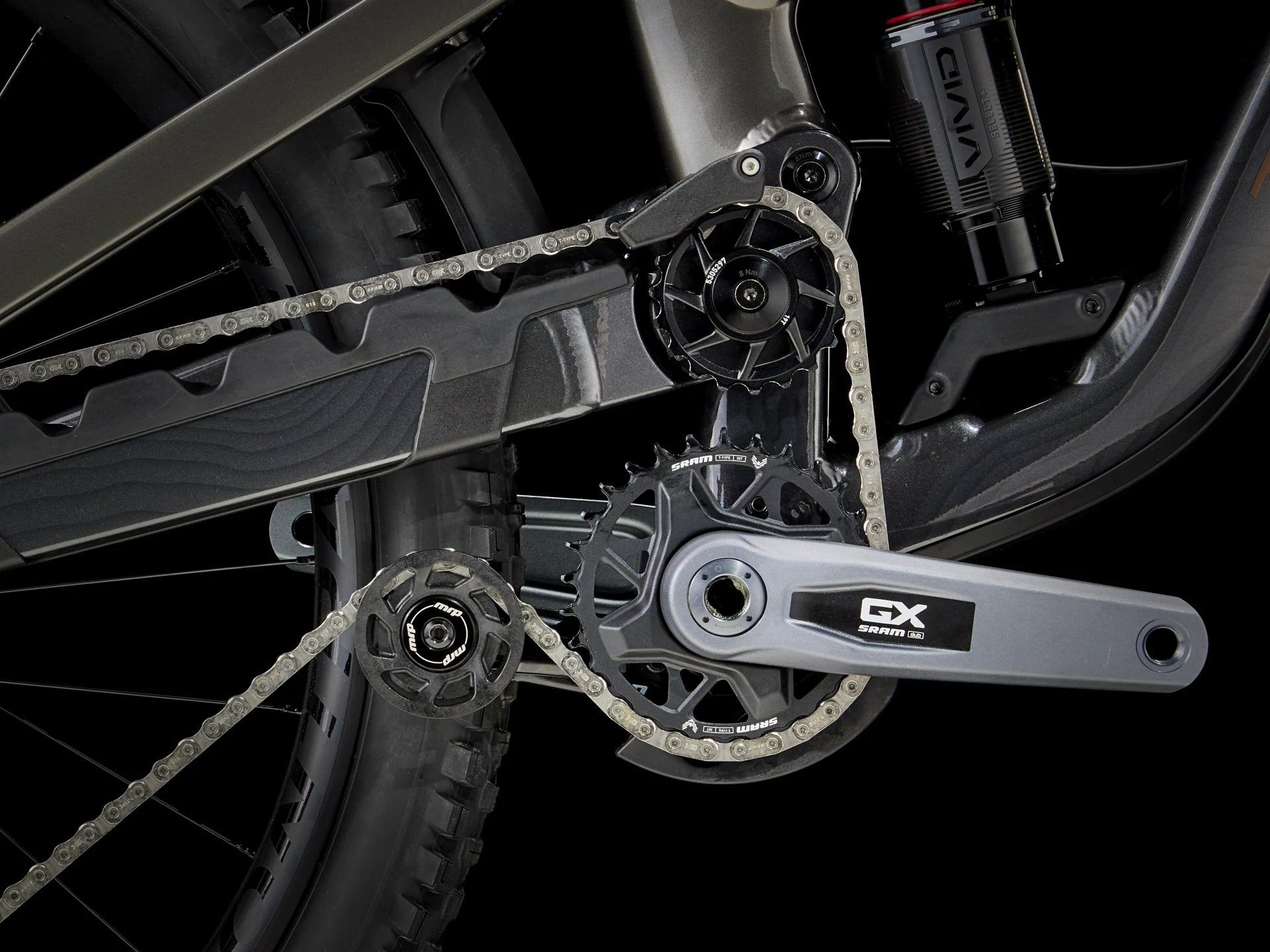 Einen Rahmen aus Alpha Platinum Aluminium mit High-Pivot-Fahrwerk und Umlenkrolle sowie ein Rahmenstaufach. Eine RockShox ZEB Select+ Gabel mit 170 mm Federweg, DebonAir Federung und Charger 3 RC2 Dämpfung und einen RockShox Vivid Select+ Hinterbaudämpfer mit ebenfalls 170 mm Hub. Außerdem die drahtlose SRAM GX AXS Transmission mit breiter Übersetzung für knackige Anstiege, eine Bontrager Line Variosattelstütze und eine Mullet-Konfiguration (29" vorn, 27,5" hinten) mit Bontrager Line Comp 30 Tubeless-Ready-Laufrädern samt Rapid Drive Nabe.
