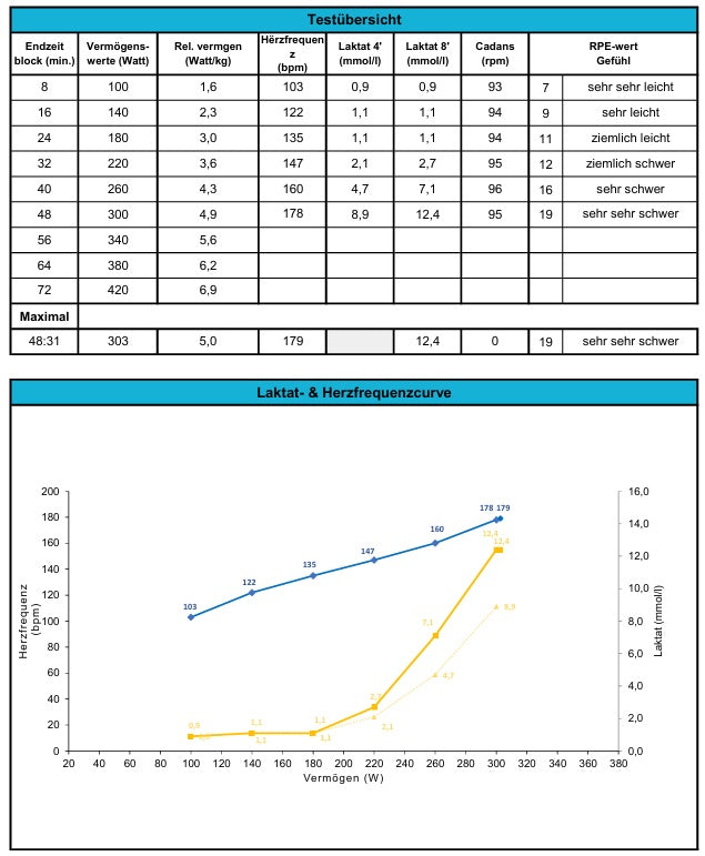Alle gesammelten Daten werden erfasst und von Michiel verarbeitet. Nach dem Test erhälst du ein Dokument in dem du die Testergebnisse inkl. Leistungs- und Pulsbereichen, Aerobe- und Anaerobe Schwelle und eine Zusammenfassung findest.