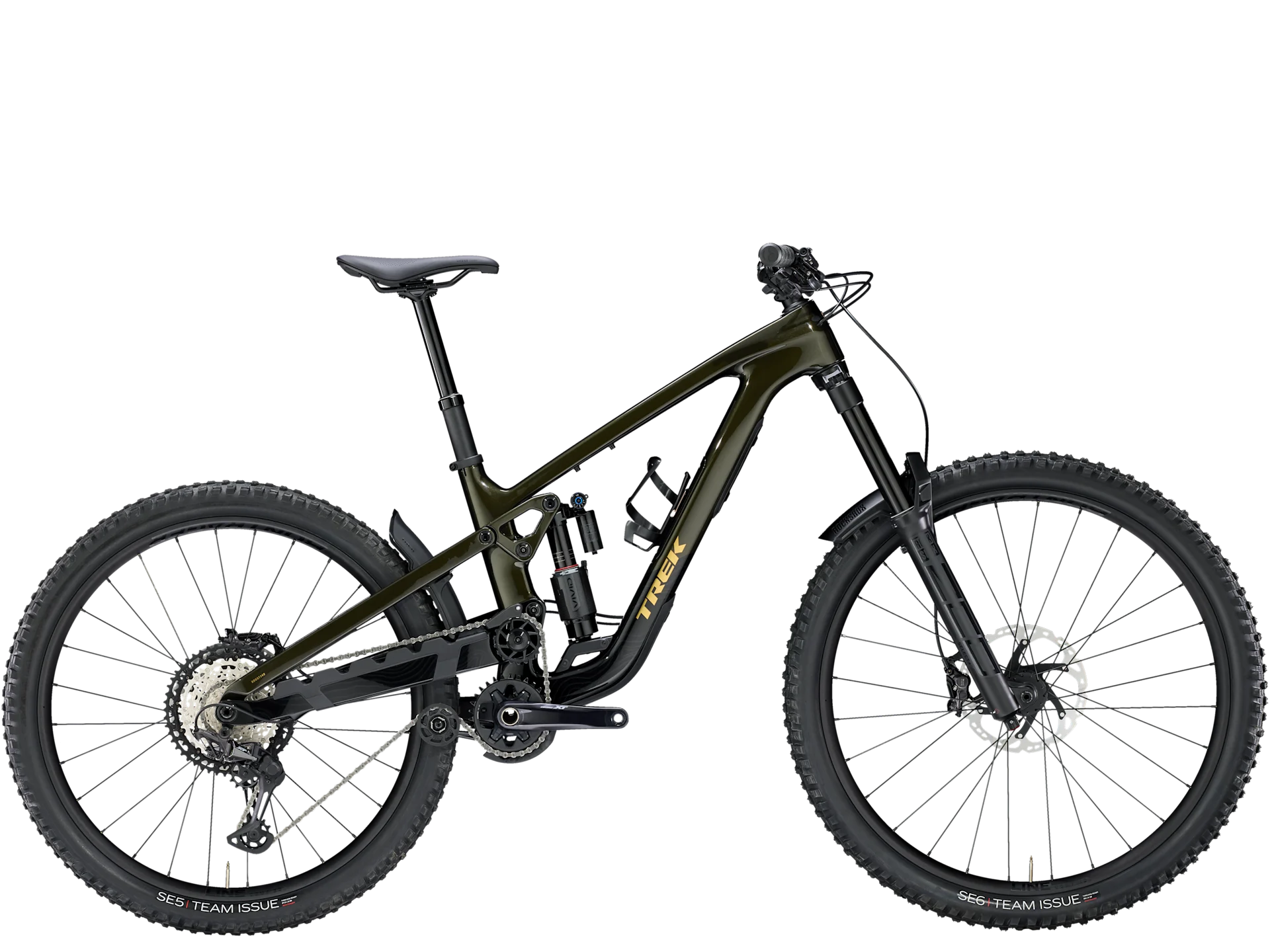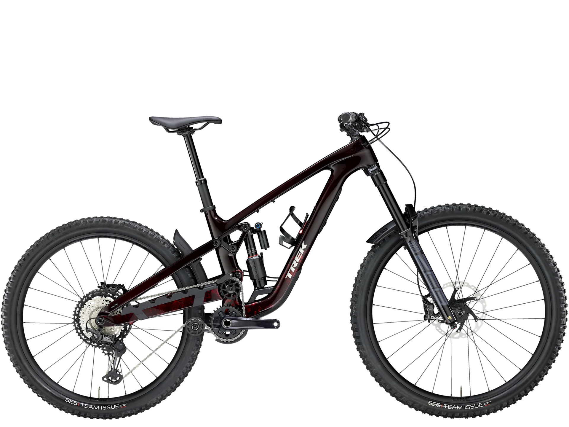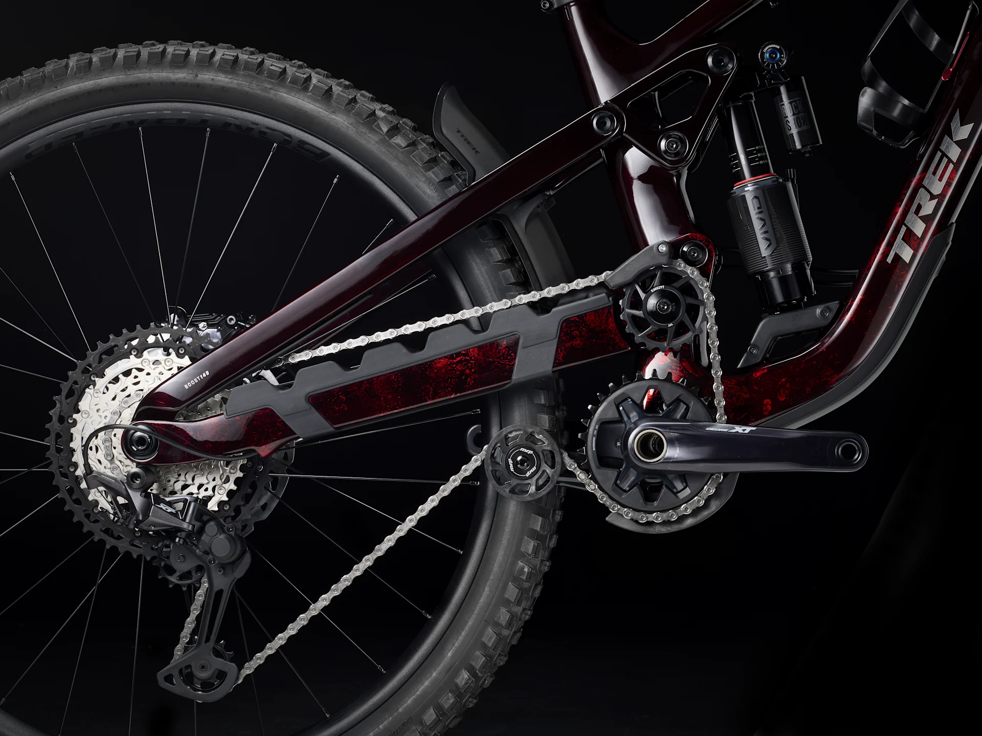 Einen Rahmen aus OCLV Mountain Carbon mit High-Pivot-Fahrwerk und Rahmenstaufach. 170 mm Federweg vorn und hinten dank RockShox ZEB Select+ Gabel mit DebonAir-Federung und Charger 3 RC2 Dämpfung sowie RockShox Vivid Select+ Dämpfer. Außerdem Shimanos XT Antrieb mit breiter Übersetzung für echte Gipfelstürmer, eine Bontrager Line Variosattelstütze und eine Mullet-Laufradkonfiguration mit Bontrager Line Comp 30 Tubeless-Ready-Laufradsatz – mit 29 Zoll großem Vorderrad und 27,5 Zoll großem Hinterrad – inklusive Rapid Drive 108 Nabe.